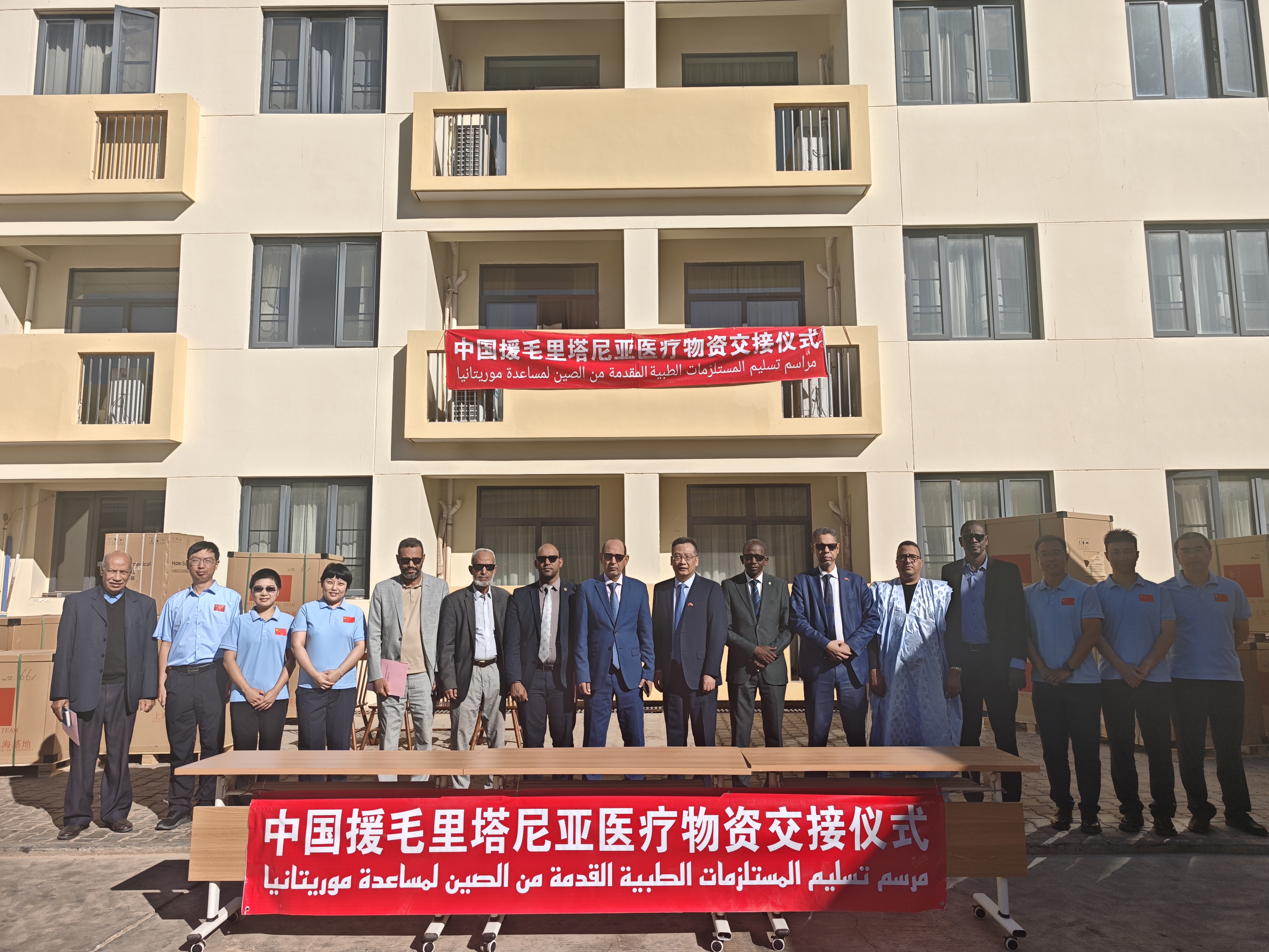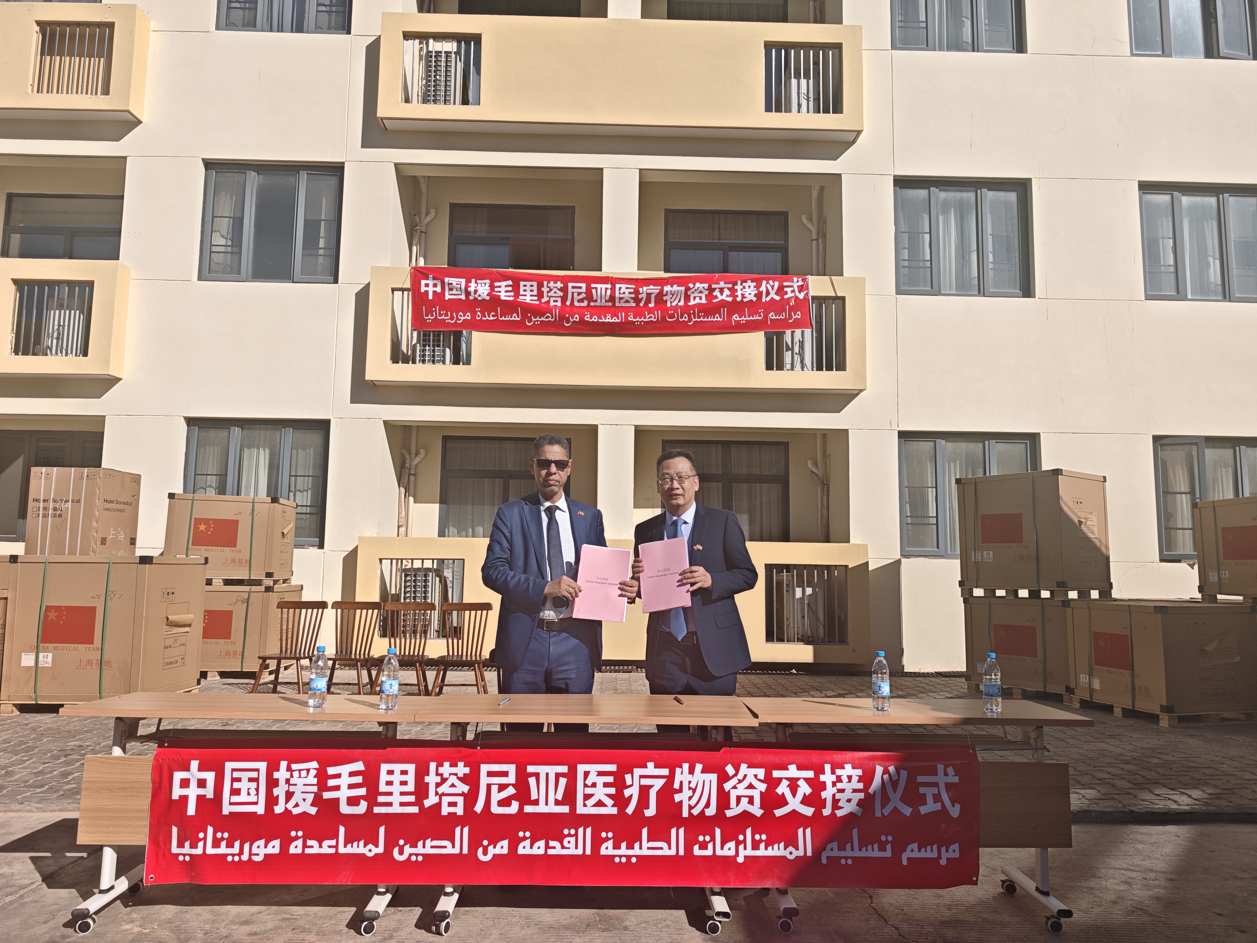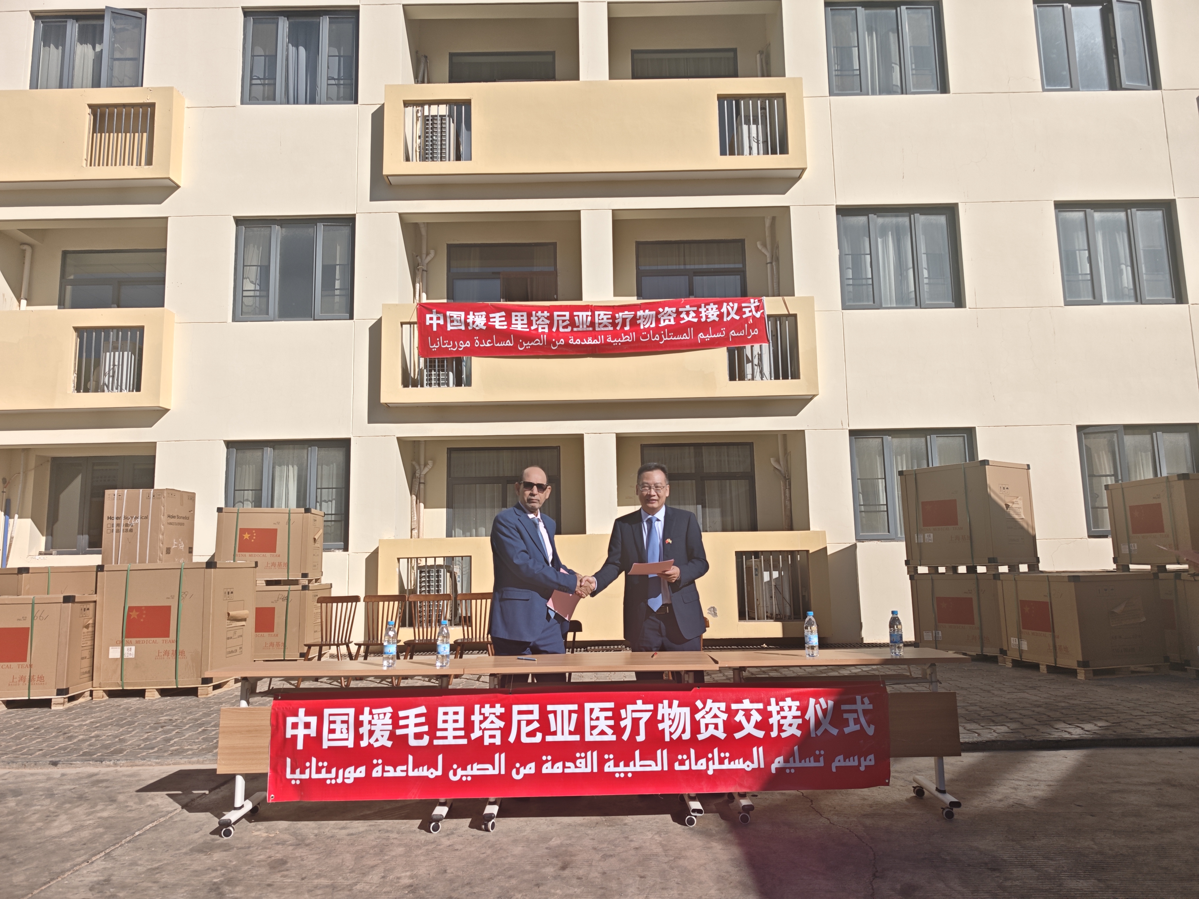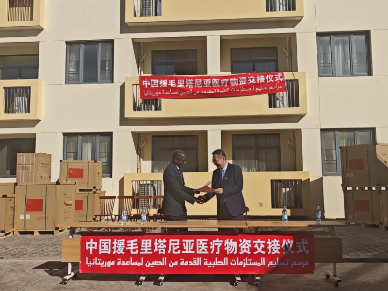 2026年1月22日,中国援毛里塔尼亚医疗物资交接仪式在医疗队驻地举行,驻毛里塔尼亚使馆负责经济事务的参赞萧文生分别与毛国家公共卫生研究院院长汉帕特·巴、友谊医院院长穆斯塔法和首都医院主任穆萨签署医疗物资交接证书。